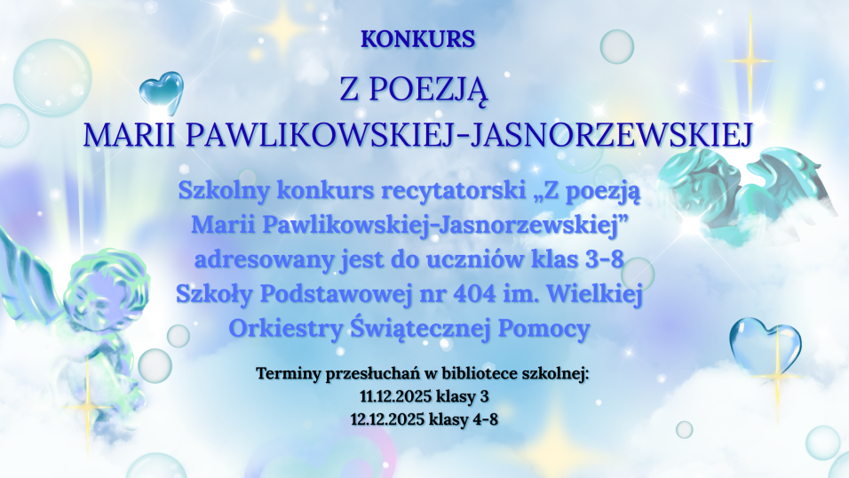 Szkolny konkurs recytatorski „Z poezją Marii Pawlikowskiej Jasnorzewskiej” adresowany jest do wszystkich uczniów Szkoły Podstawowej nr 404.