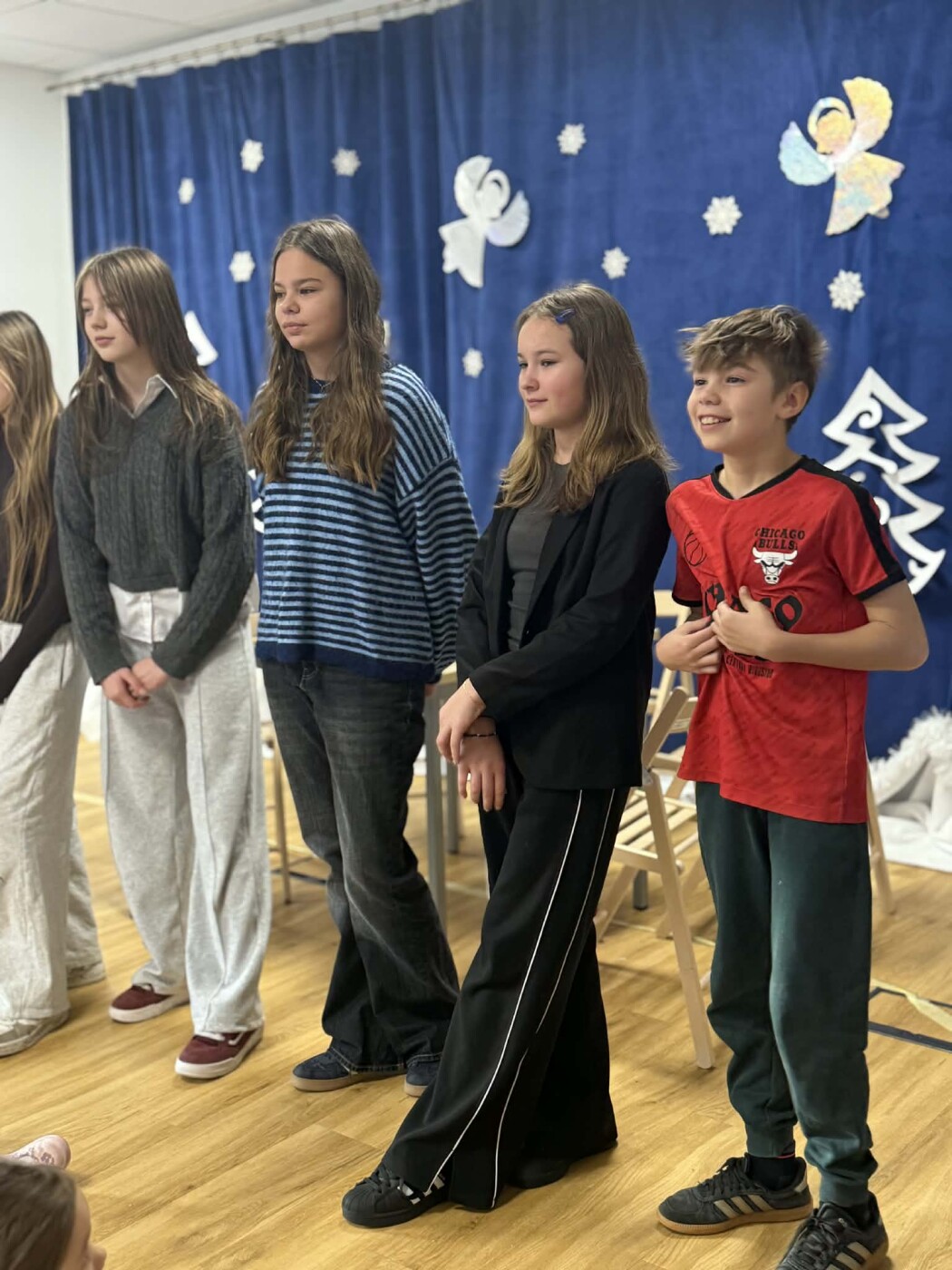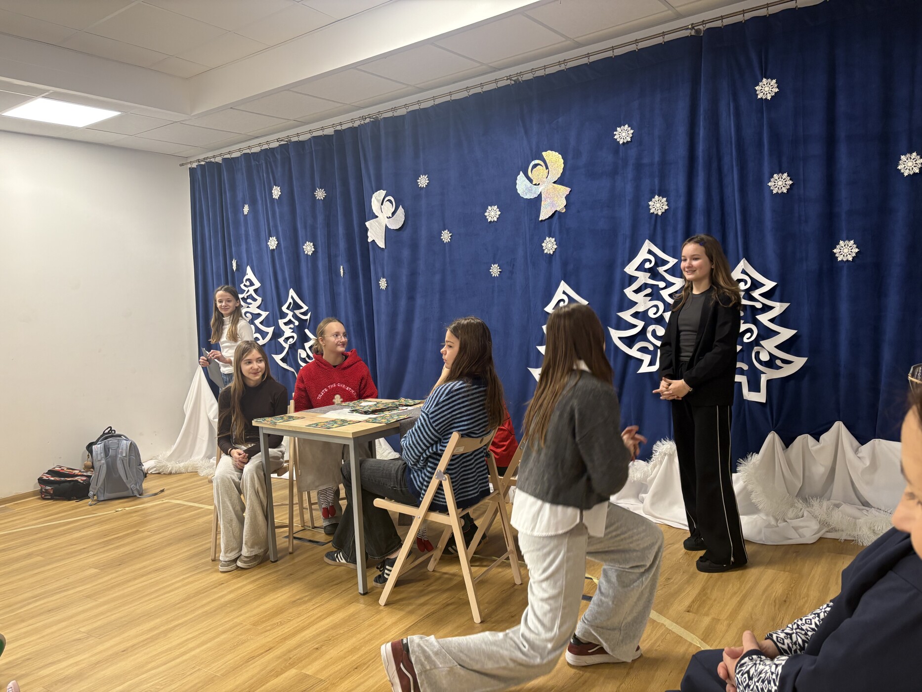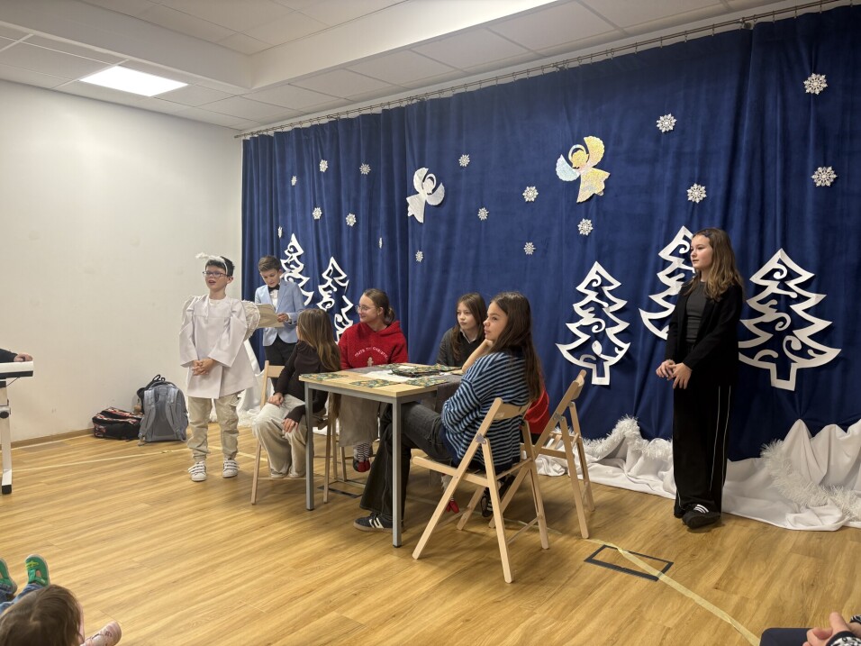 Klasa 5c przygotowała wyjątkowe świąteczne przedstawienie dla przedszkolaków. Mali widzowie z radością oglądali występy starszych kolegów, a sala wypełniła się świąteczną atmosferą, uśmiechami i ciepłem.