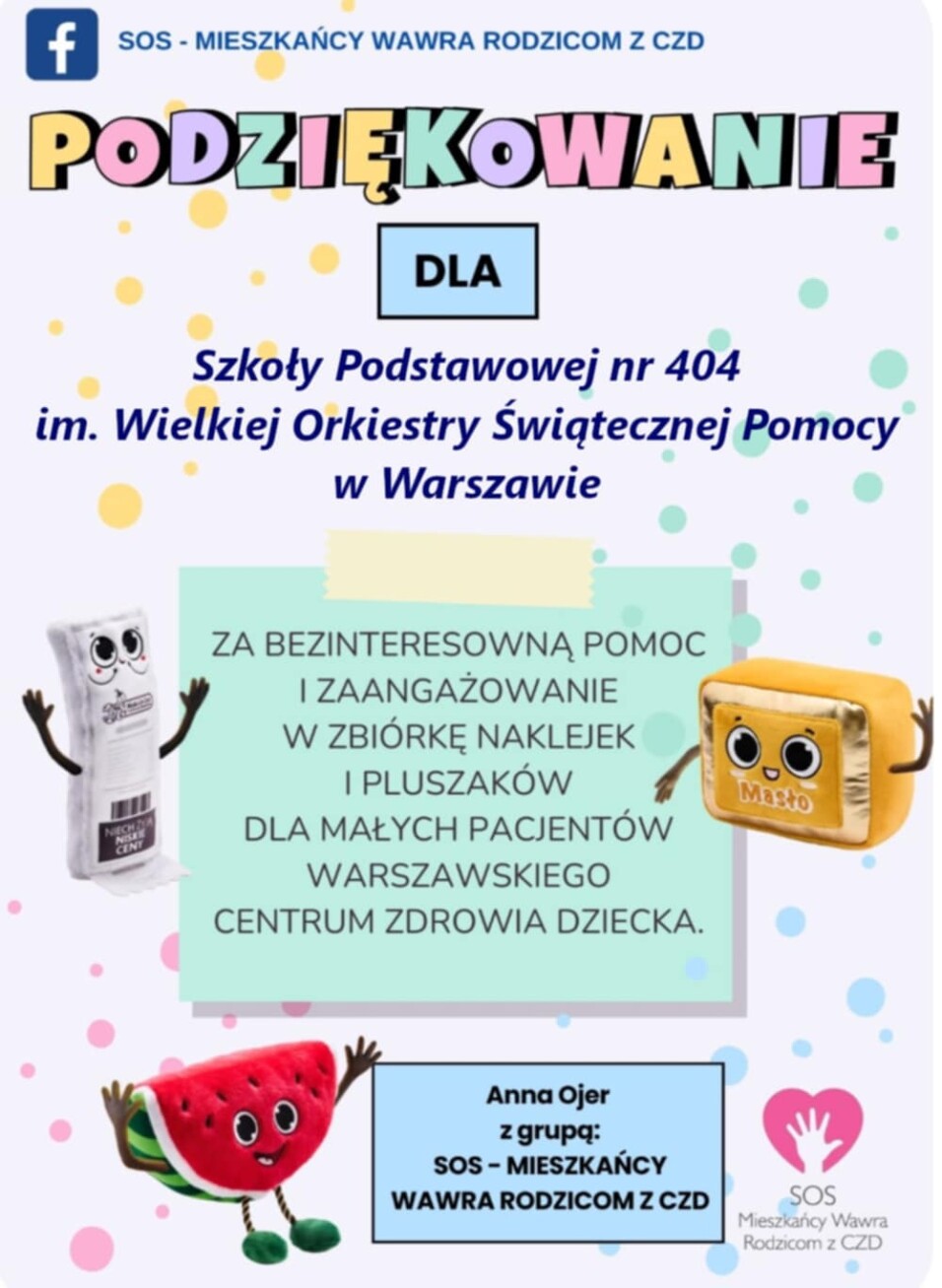 Serdecznie dziękujemy wszystkim, którzy włączyli się w akcję charytatywną polegającą na zbieraniu naklejek i pluszaków ze sklepu Biedronka. Dzięki Waszemu zaangażowaniu, otwartym sercom i chęci niesienia pomocy udało się zebrać ponad 50 zabawek, które trafią do dzieci z Centrum Zdrowia Dziecka.